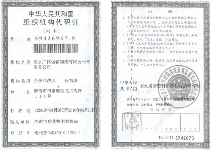 衡水广怀运输物流有限公司淮南分公司组织机构代码证